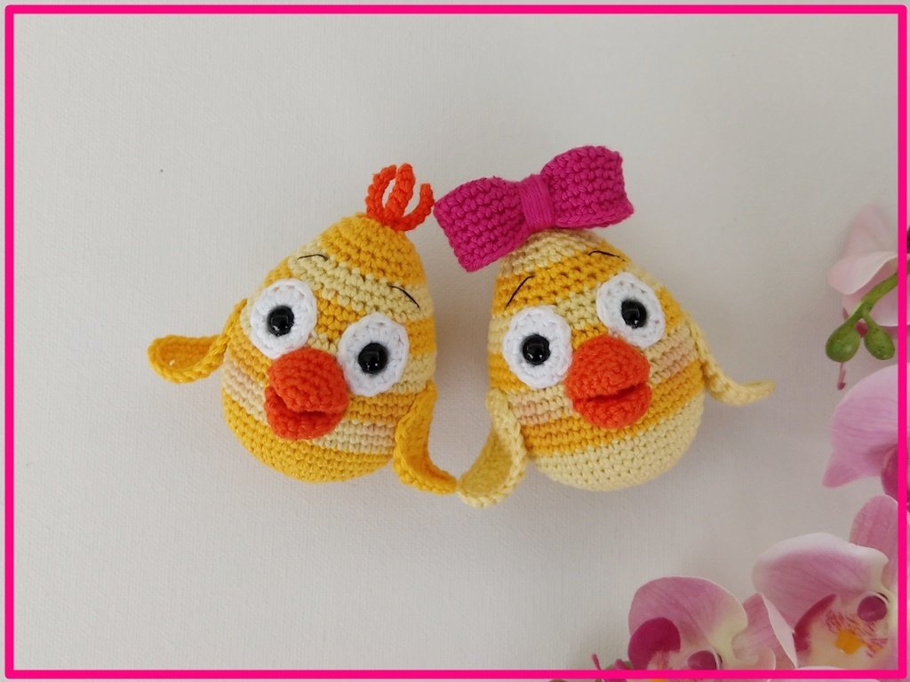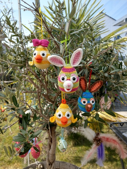 Mit angegebenen Garn werden die lustigen Eier ca. 7 cm (Küken) und ca. 12 cm (Häschen) groß.