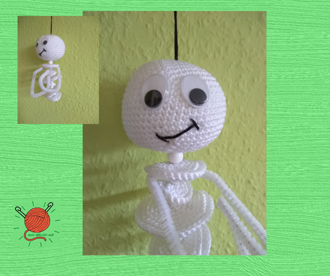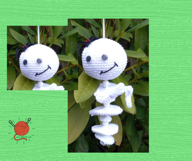 50 g Baumwolle in Weiß, Füllwatte, Halbperlen/Wackelaugen mit 8 mm Größe, 1 Pfeifenputzer in Weiß, 30 g Baumwolle in Schwarz oder Wunschfarbe für den Hut, 7 Perlen mit 8-10 mm Durchmesser und Loch Häkelnadel 2,5 Stopfnadel zum Zusammennähen Schere Maschenmarkierer, es wird in Spiralrunden gehäkelt 1 ca. 80 cm langer Faden zum auffädeln der Körpersegmente/Kopf dieser dient dann auch als Aufhängung