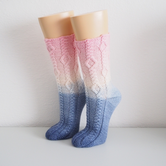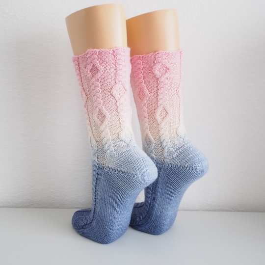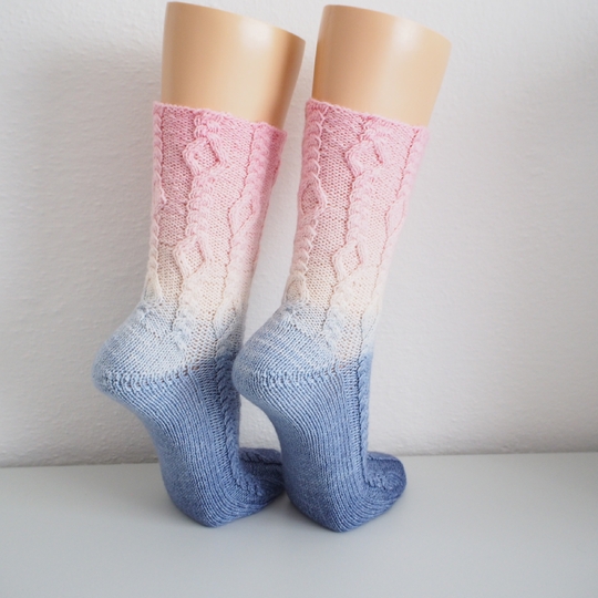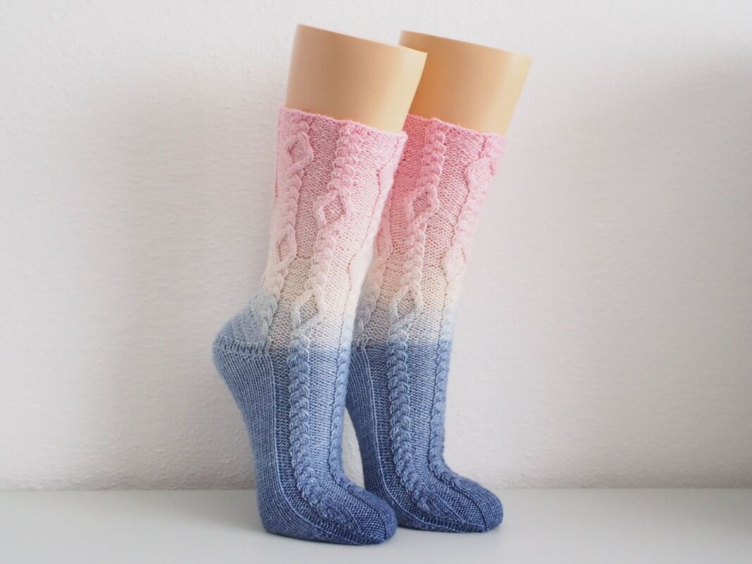 In der Anleitung sind die Bumerangferse und Bandspitze beschrieben aber du kannst auch jede Ferse die dir gefällt, stricken.