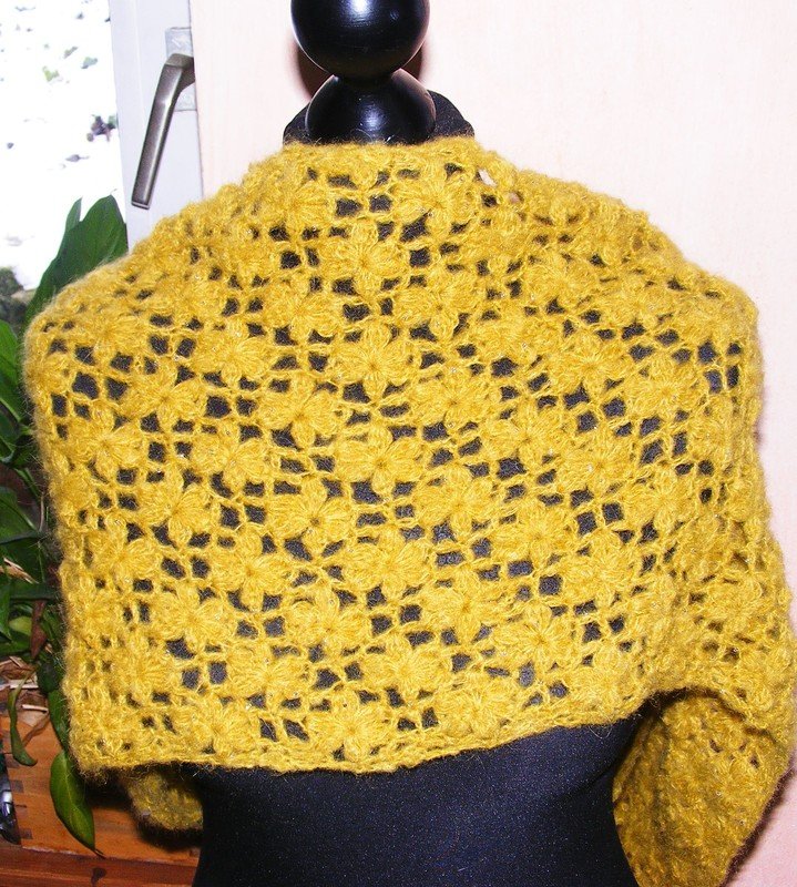 Es handelt sich um ein Gittermuster mit Blumen. Die Blütenblätter werden in zwei Reihen aus gemeinsam abgemaschten Stäbchen gehäkelt. Je nachdem, wie dicht Ihr Euer Häkelstück haben möchtet, könnt Ihr mit 3 oder 4 zusammen abgemaschten Stäbchen oder auch mit Büschelmaschen arbeiten.