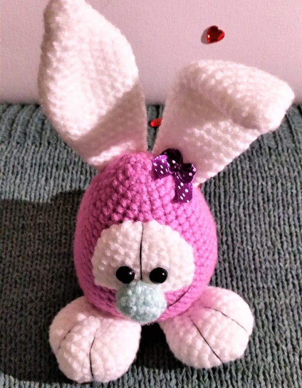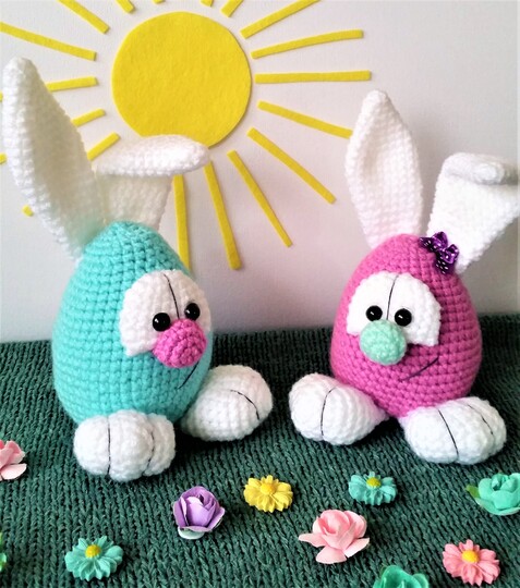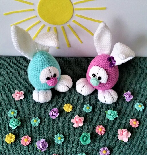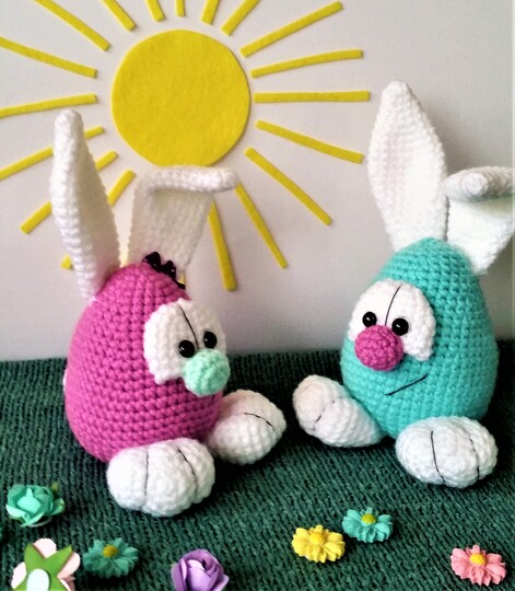 Die beiden zuckersüssen Eierhasen genießen den Sonnenschein im Blumenbeet :-)