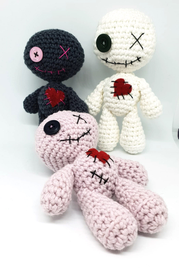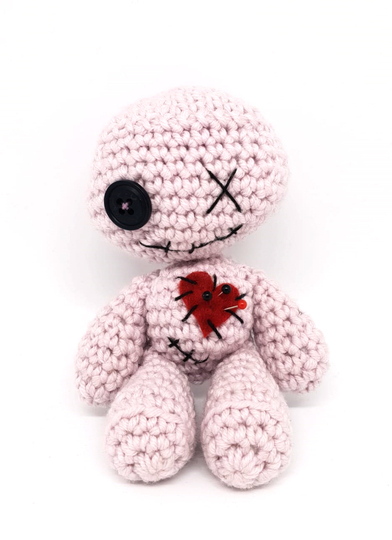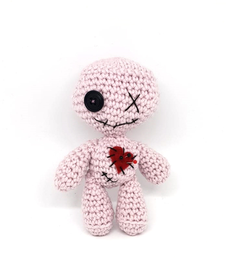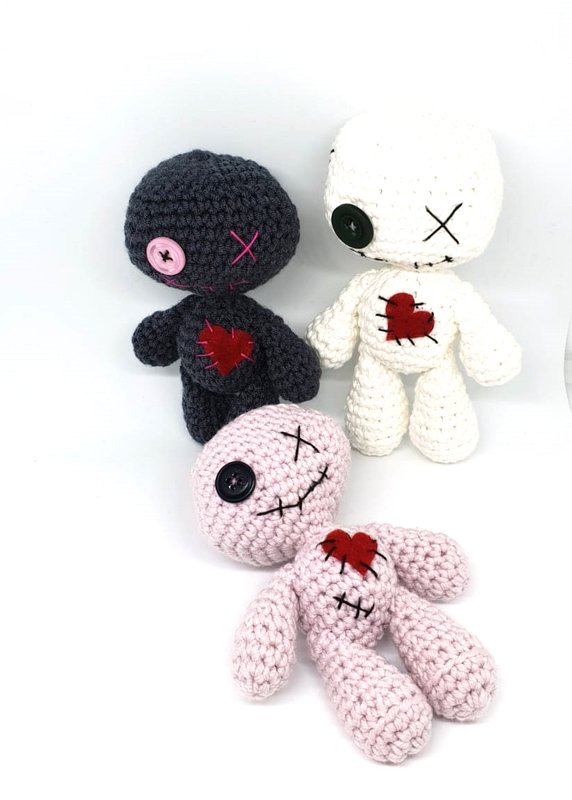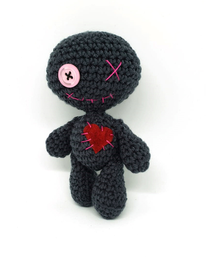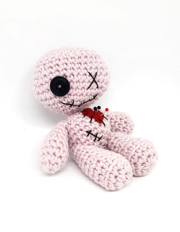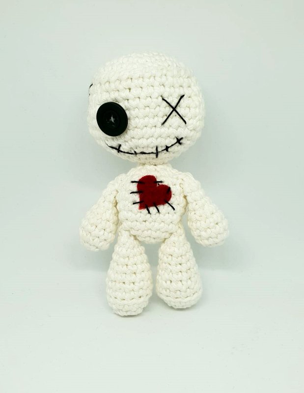 ALLE TEILE DER VOODOOPUPPE WERDEN SPIRALFÖRMIG GEHÄKELT. DIE PUPPE KANN NATÜRLICH AUCH MIT DÜNNERER WOLLE/GARN UND DAZUPASSENDER HÄKELNADELSTÄRKE GEHÄKELT WERDEN, DAS ERGEBNIS FÄLLT DANN ALLERDINGS DEUTLICH KLEINER AUS. EIN KNOPF MIT WENIGER DURCHMESSER WÄRE PROPORTIONAL DANN PASSENDER.