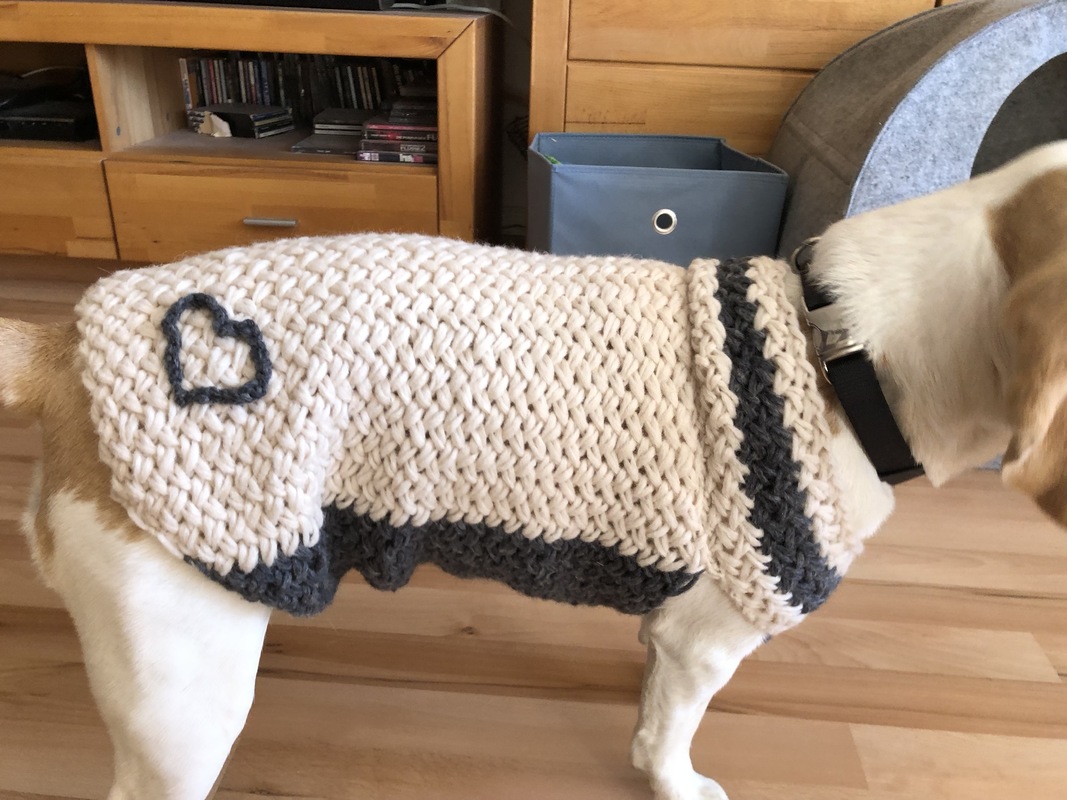 Dieser Hundepullover kann für klein bis mittelgroß gestrickt werden. Mein Beaglemädchen Sally auf dem Foto trägt Größe M. Durch die relativ großen Armausschnitte lässt sich der Pullover an kalten Tagen leicht anziehen. Das Strukturmuster sorgt für viele Schichten Wolle und somit ausreichend Wärme für den Vierbeiner.