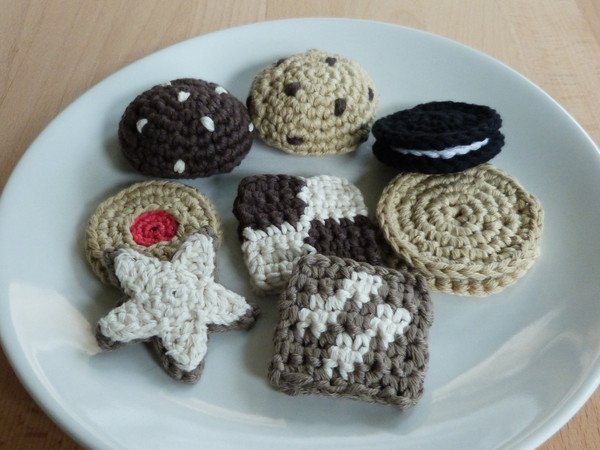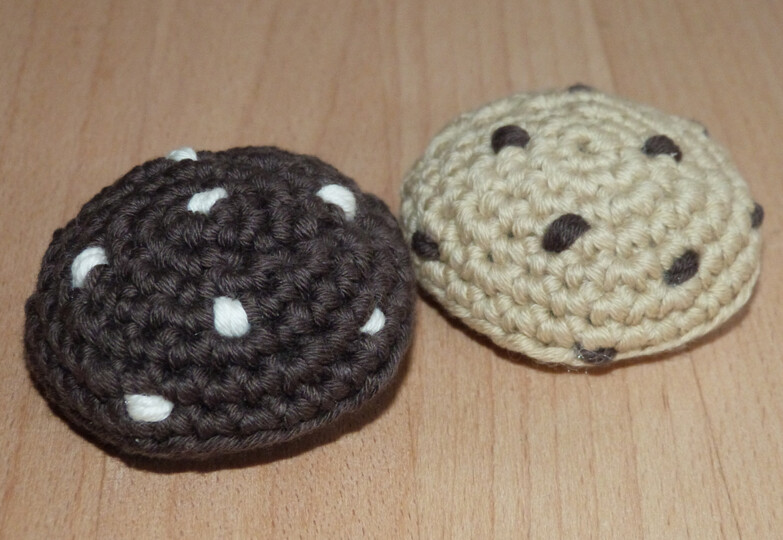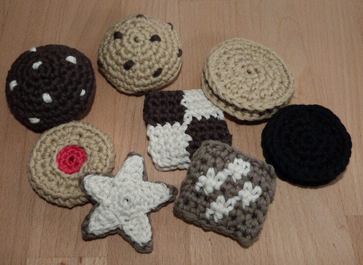 Baumwollgarn mit einer Lauflänge von ca. 90m/50g, Häkelnadeln Stärke 3,5 und 2,5, etwas Watte für die Füllung der Cookies
