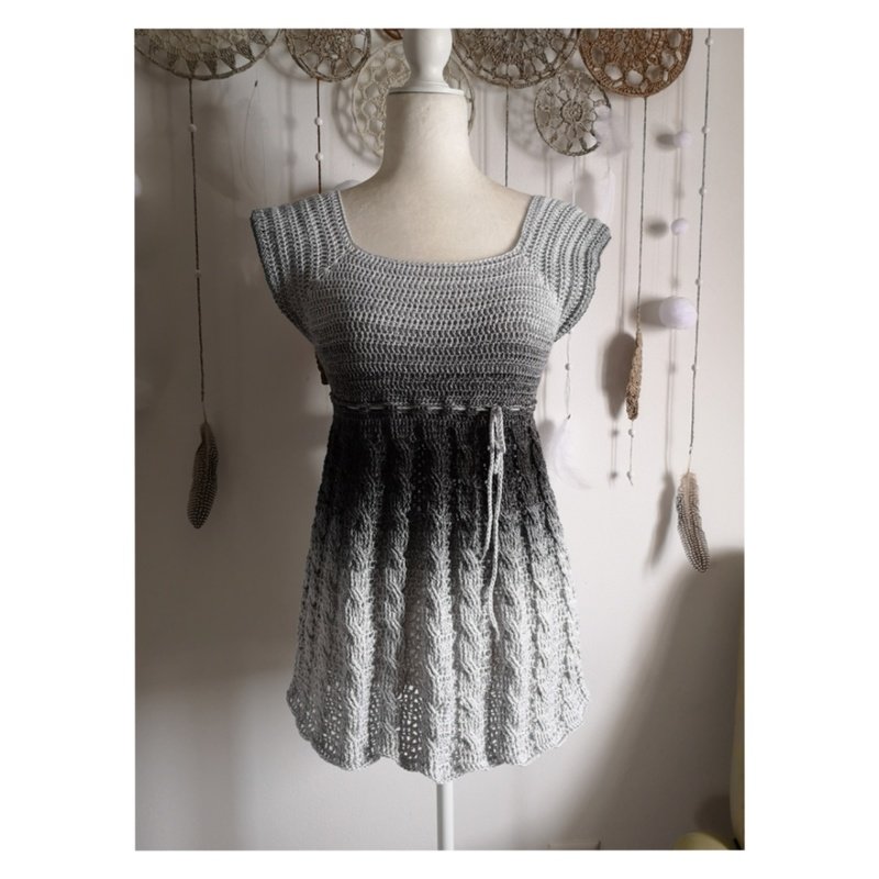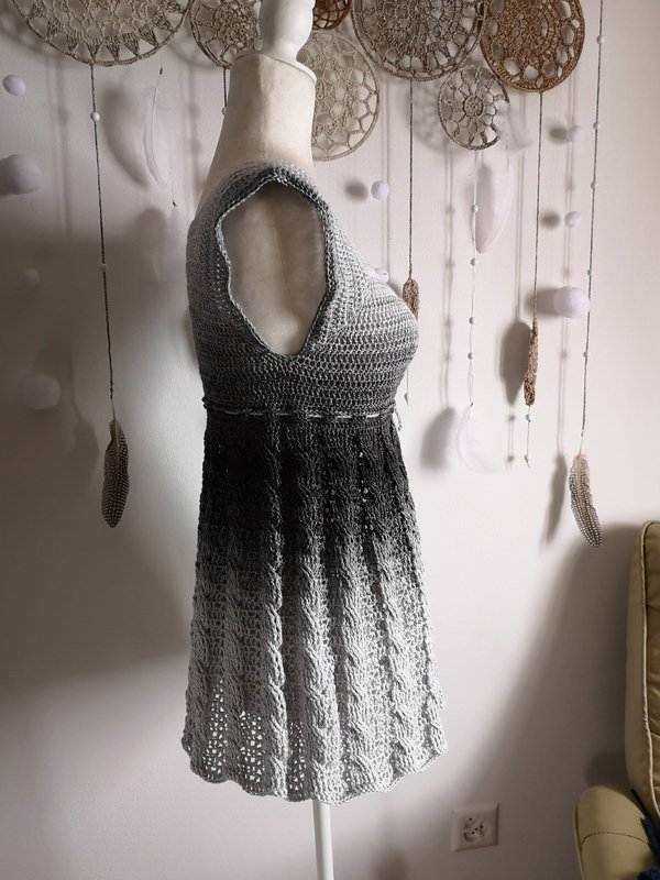 Die fertige Tunika hat eine Länge von 63cm bekommen. Man muss die Maschenprobe beachten und dieselbe Garnstärke verwenden. Ansonsten muss man die Maschenzahl anpassen. Wenn man noch nie Zöpfe gehäkelt hat, ist dies perfekt um sie zu üben.