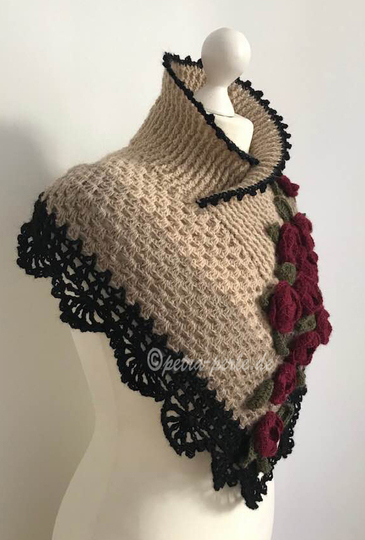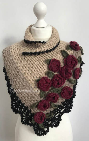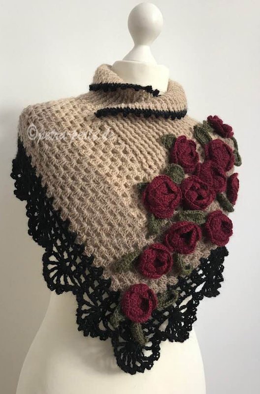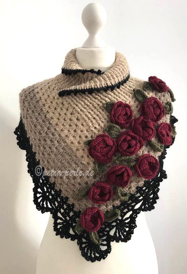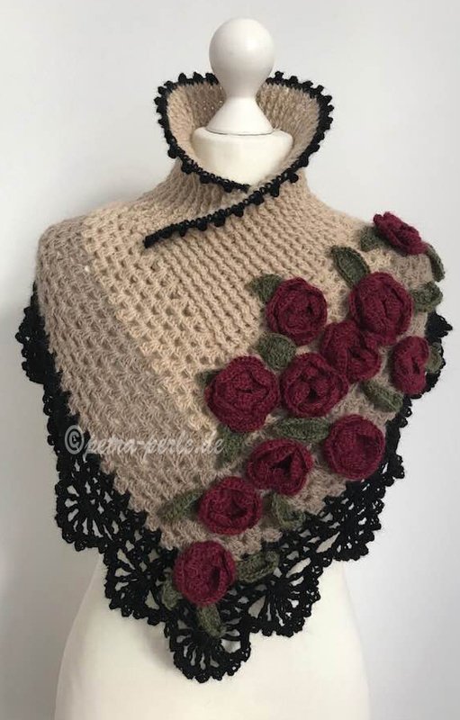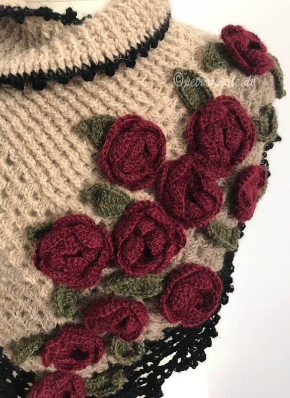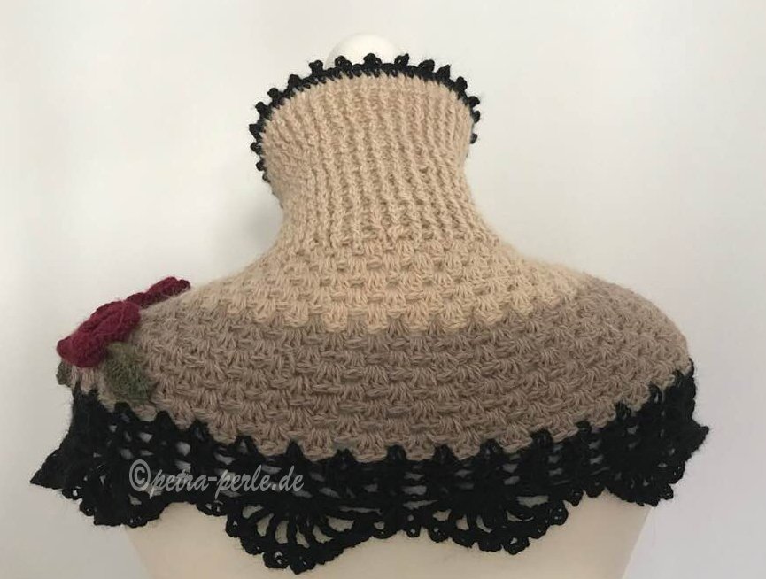 Der Kragen ist fertig 32-35 cm breit… Den Kragen selber locker häkeln… Die Blumen und die Blätter eher fest… Dann bleiben Sie lange in Form
