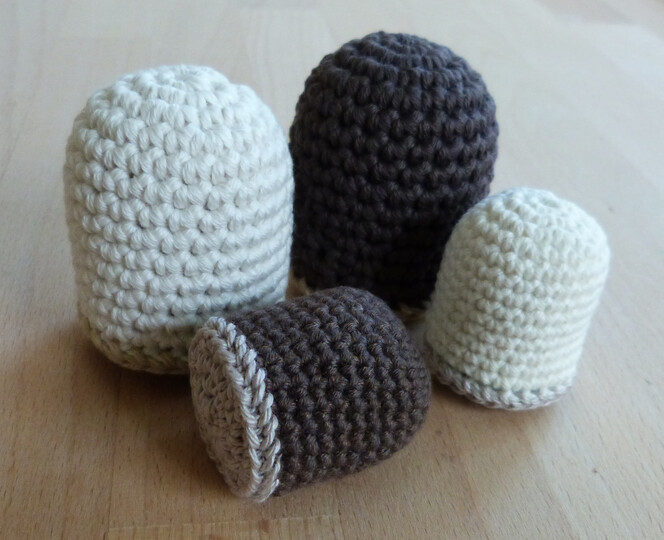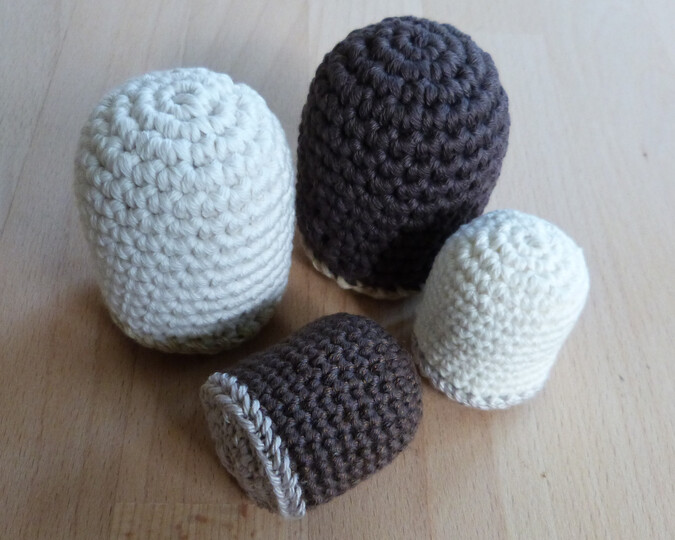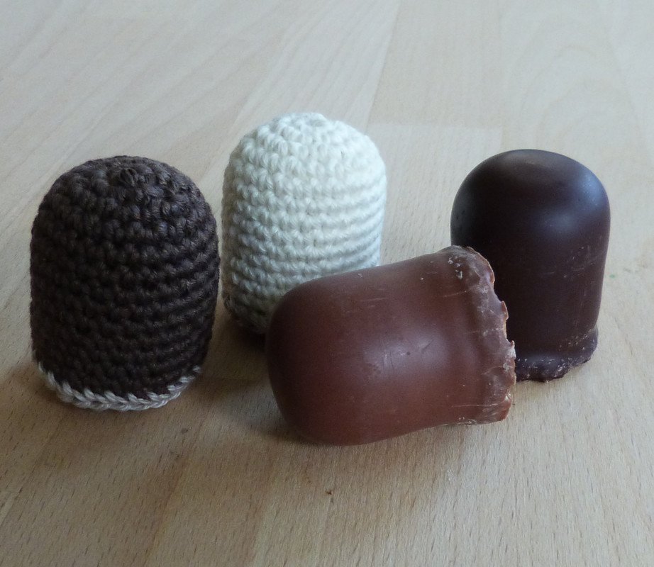 Bei Verwendung der angegebenen Garn- und Nadelstärken werden die Schokoküsse etwa so groß wie die Originale.