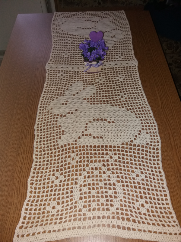 Der Tischläufer hat das Maß von ca. 38cm x 107cm, dafür habe ich 3 Knäul a` 180m / 50g benötigt.