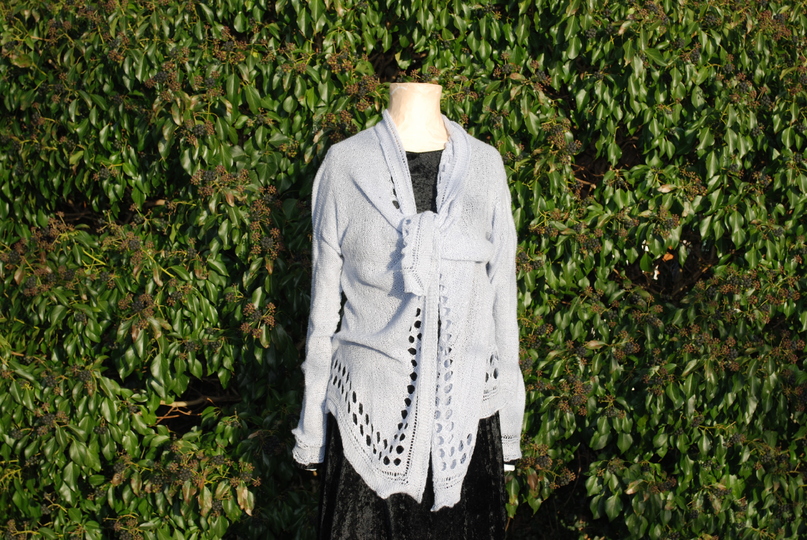 Leichte Sommer-Jacke mit Lochmuster in Größe L, für festlich Anlässe. Es werden zwei identische Teile von der vorderen Ecke aus gestrickt, die im Rücken zusammentreffen.