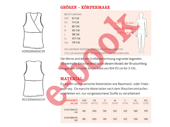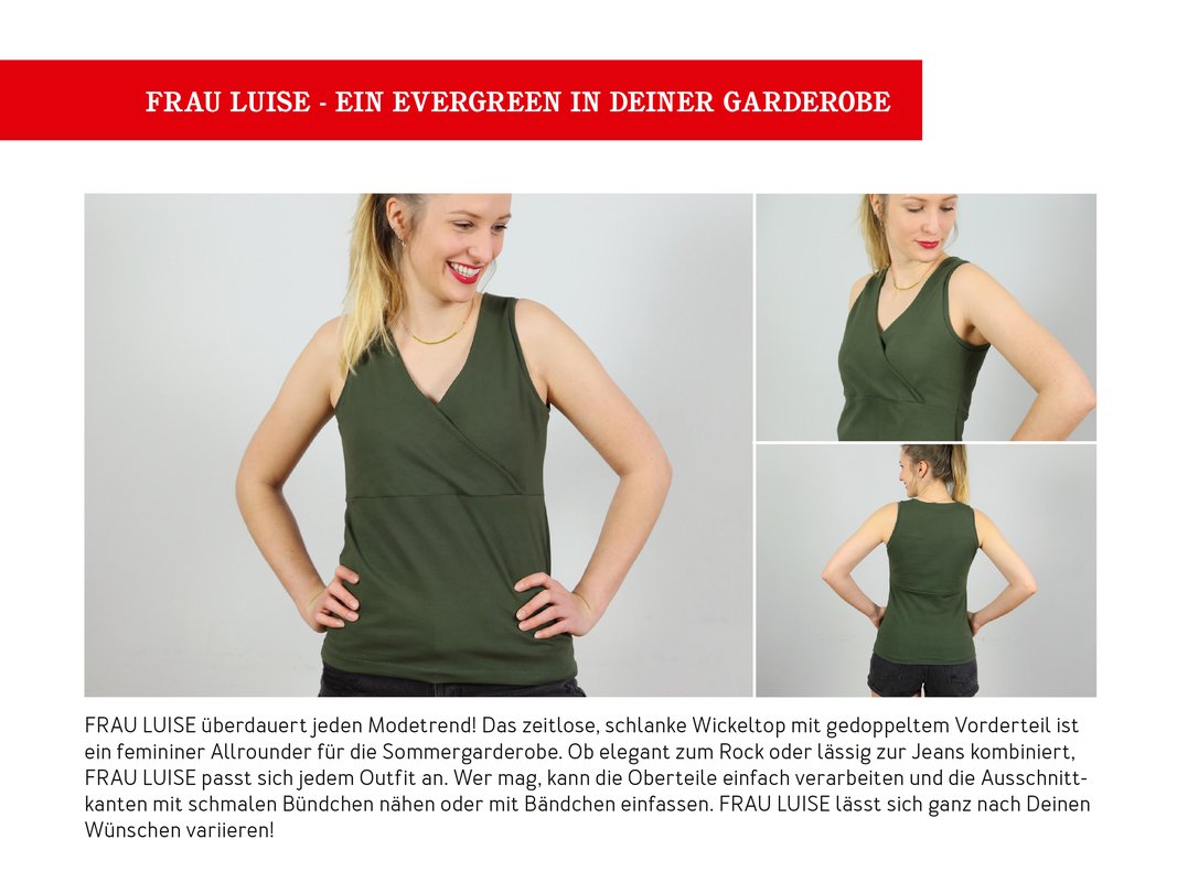 FRAU LUISE überdauert jeden Modetrend! Das zeitlose, schlanke Wickeltop mit gedoppeltem Vorderteil ist ein femininer Allrounder für die Sommergarderobe. Ob elegant zum Rock oder lässig zur Jeans kombiniert, FRAU LUISE passt sich jedem Outfit an. Wer mag, kann die Oberteile einfach verarbeiten und die Ausschnittkanten mit schmalen Bündchen nähen oder mit Bändchen einfassen. FRAU LUISE lässt sich ganz nach Deinen Wünschen variieren!