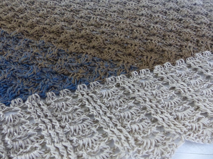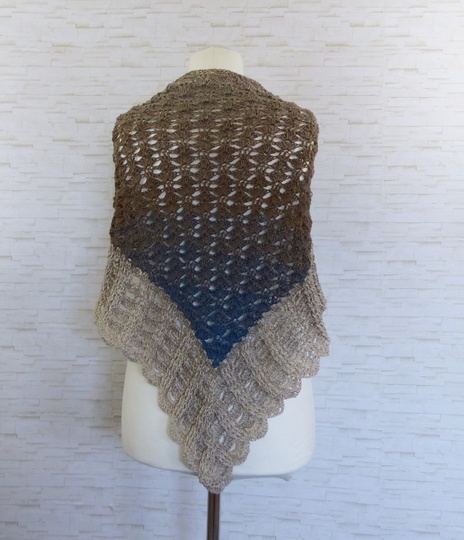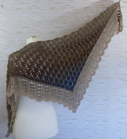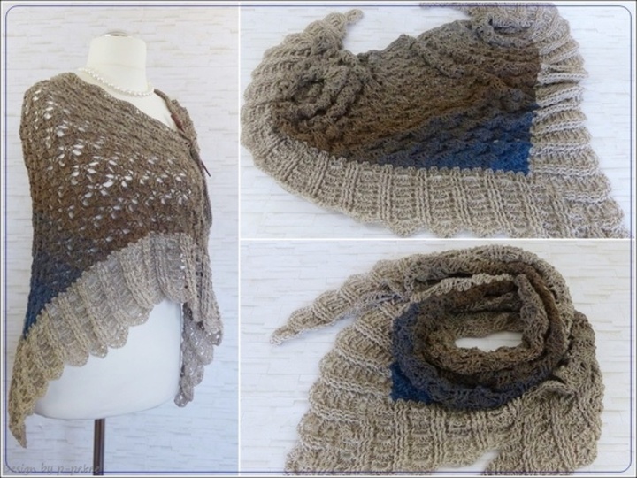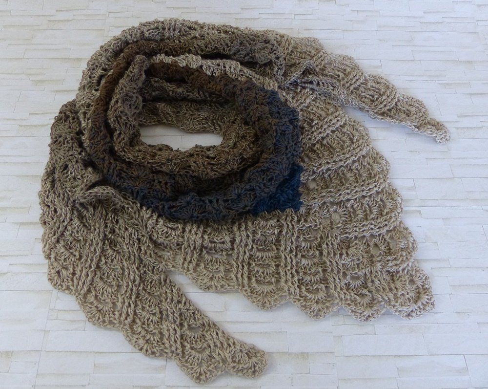 "Sandur" heißt übersetzt Sand. Das Tuch erinnert mich nämlich an eine Sanddüne mit Muscheln und Meer. Das Dreieckstuch ist raffiniert in zwei Richtungen gehäkelt. Die unterschiedlichen Häkelrichtungen machen auch den Farbverlauf des Tuches einzigartig.
