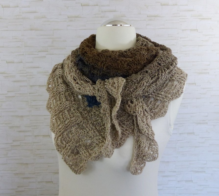 Das Dreieckstuch kann in der Größe individuell selbst gestaltet werden, ist leicht zu häkeln und schaut gut aus. Das Muster wiederholt sich und ist leicht zu merken! Das abgebildete Tuch hat eine Breite von ca. 170 cm und ist ca. 70 cm hoch.