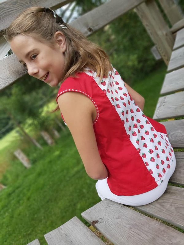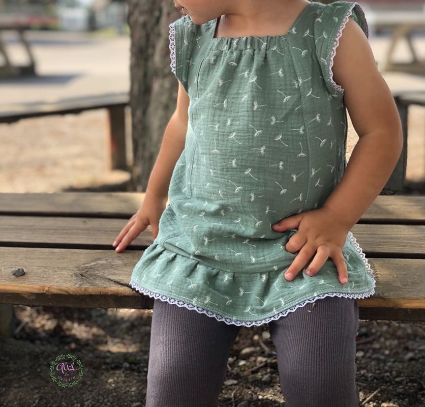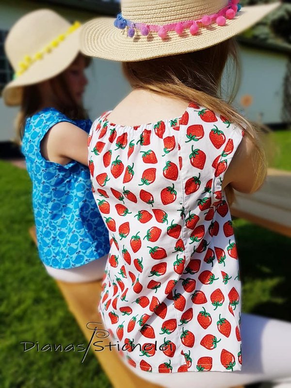 Drosia kannst du in zwei verschiedenen Längen nähen: Die „Blusenlänge“ ist wie eine Bluse eher kurz geschnitten und sieht toll zu Shorts aus. Zu Leggings passt die „Tunikalänge“, die den Po bedeckt. Bei beiden Varianten kannst du zwischen verschiedenen Trägerbreiten wählen. Die breiteren Träger reichen wie angeschnittene Ärmel über die Schulter, während das Top mit schmalen Trägern noch sommerlicher wird. Alternativ können an die schmalen Träger süße Flügelärmelchen genäht werden.
