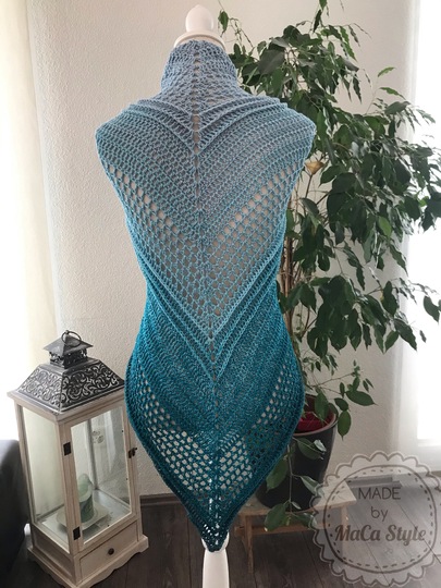 Dieses wunderschöne Dreieckstuch wurde aus einem 200g Bobbel (4-fädig, ca. 850 m LL) hergestellt. Ich habe hier NS 5,5 verwendet. Ihr könnt andere Wolle mit passender NS nehmen. Beachtet bitte, dass sich dann die Grösse des fertigen Werkes ändert.