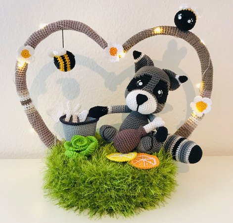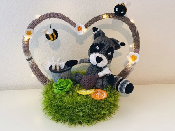 Die Anleitung enthält alle Angaben, um den Waschbär, die Deko, den Herzbogen und die Wiese zu erstellen.