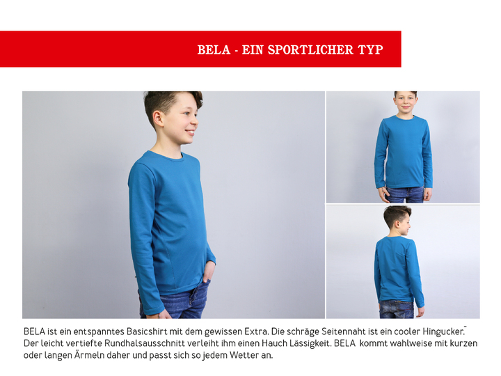 BELA ist ein entspanntes Basicshirt mit dem gewissen Extra. Die schräge Seitennaht ist einen cooler Hingucker. BELA kommt wahlweise mit kurzen oder langen Ärmeln daher und passt sich so jedem Wetter an.