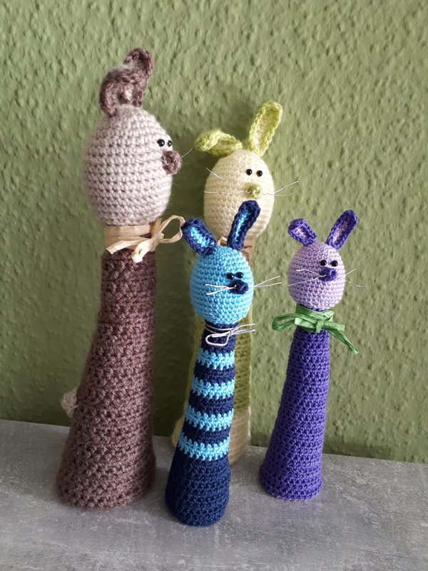 Je nach Wollsorte (Acryl, Baumwolle) ist der Hase entweder ca. 27cm oder 20cm hoch.
