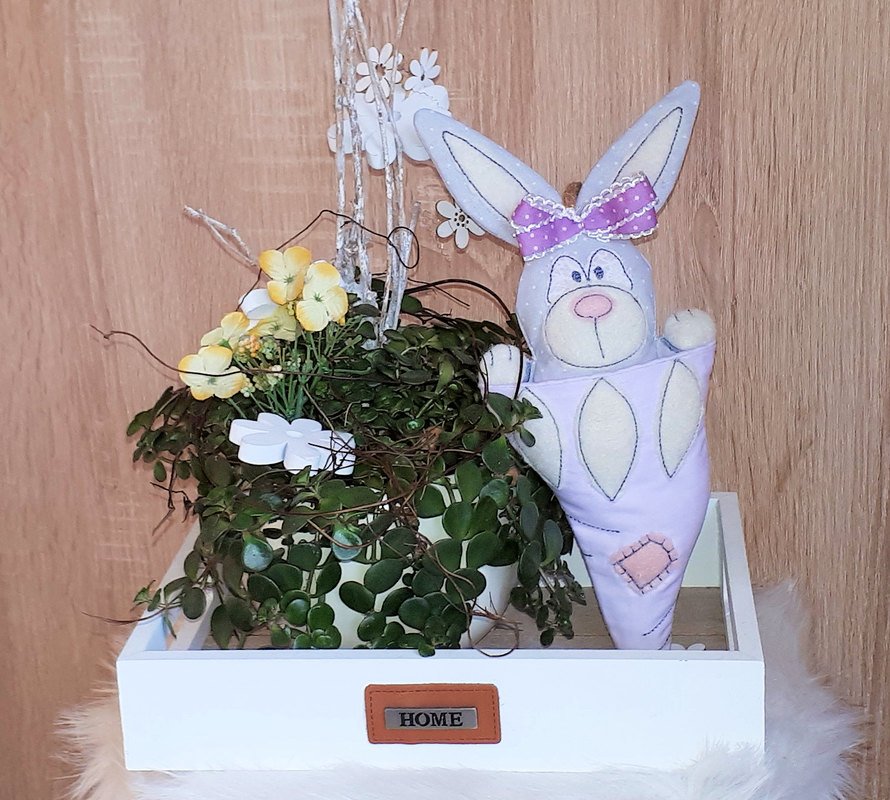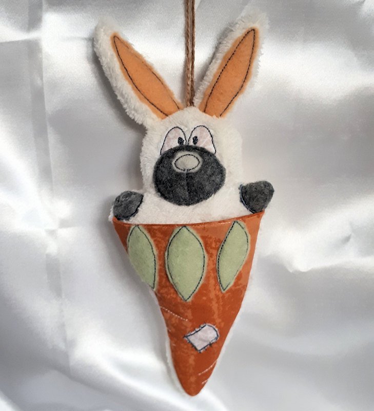 ITH-Stickdatei eines dekorativen Hasen mit vorderseitiger Tasche, in Form einer Karotte, zum befüllen. Die Wendeöffnung ist im inneren der Tasche versteckt.
