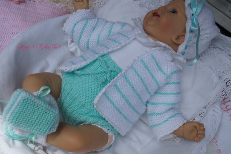 Strickanleitung für ein wunderschönes Set, 4-teilig für Babys & Reborns, Gr. 50 -56 Das Set ist aus Babysoftwolle Nd. - Nr. 3 gestrickt. Die Anleitung ist sehr genau beschrieben und mit vielen Fotos. Auch ohne viel Strickerfahrung kannst Du mit dieser Schritt – für – Schritt – Anleitung dieses Set leicht nacharbeiten.