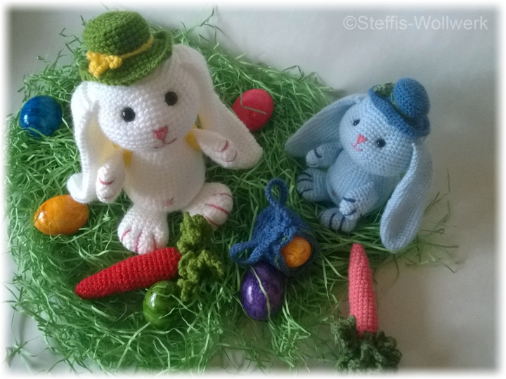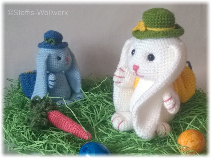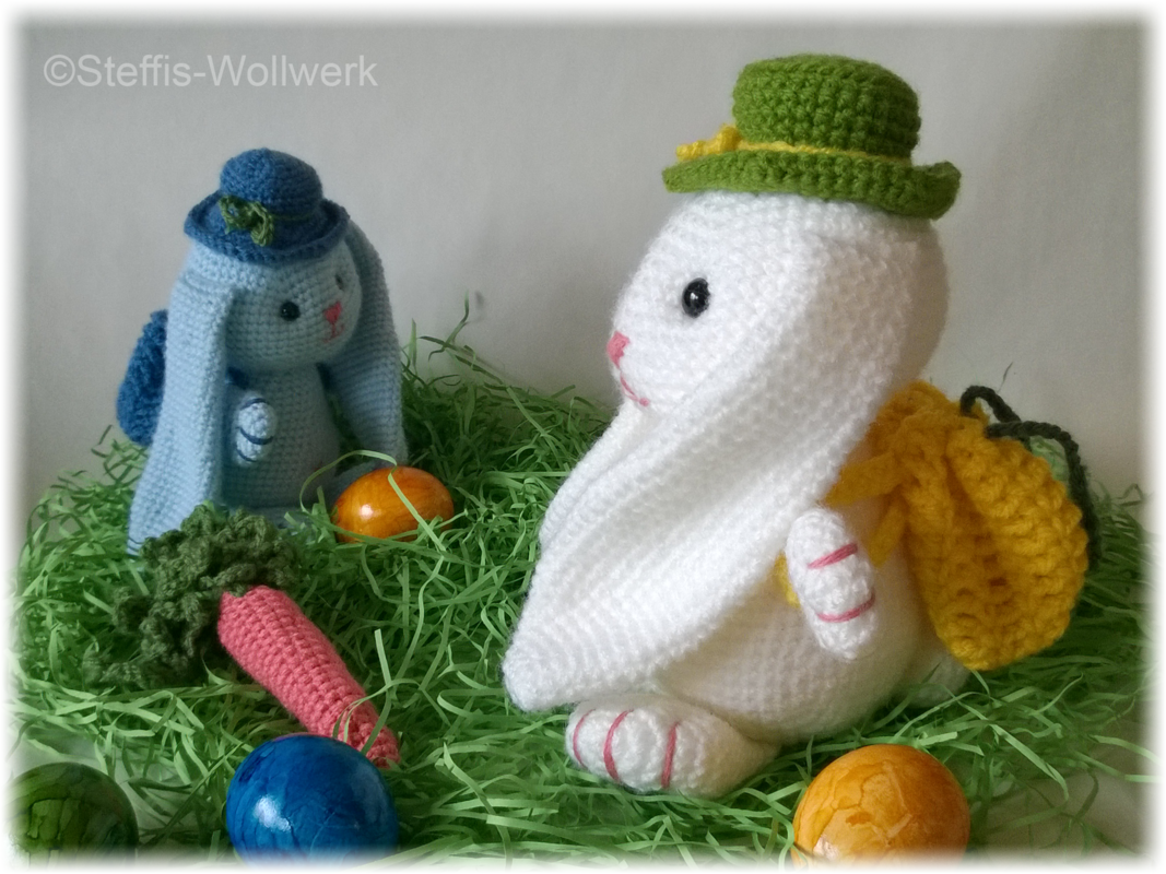 (Der weiße Hase ist 22 cm hoch und mit NS 4 und LL 241m / 100 g gehäkelt).