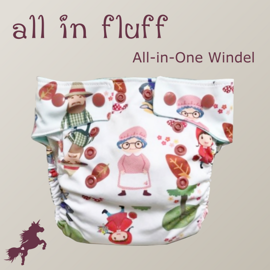 all in fluff besteht aus einer wasserdichten Außenwindel und einem saugenden Inlay. Das Inlay ist an den Beinbündchen nicht mit der Außenwindel vernäht. Das hat gleich mehrere Vorteile: Ihr könnt komplett natürliche Materialien verwenden und es läuft garantiert nicht an den Beinbündchen aus. Das Inlay wird beim Waschen besser durchspült und trocknet schneller als bei herkömmlichen AiOs. Durch das passformoptimierte Inlay besteht kein Kontakt zur PUL-Beschichtung der Außenwindel.