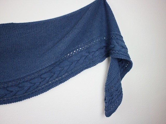 12 Maschen und 32 Reihen auf 10 cm in kraus rechts, nach dem Waschen. Die Maschenprobe ist nicht so wichtig bei diesem Projekt. Eine andere Maschenprobe führt allerdings zu einem größeren oder kleineren Tuch bzw. zu einem anderen Garnverbrauch.