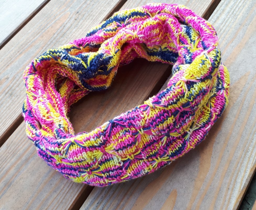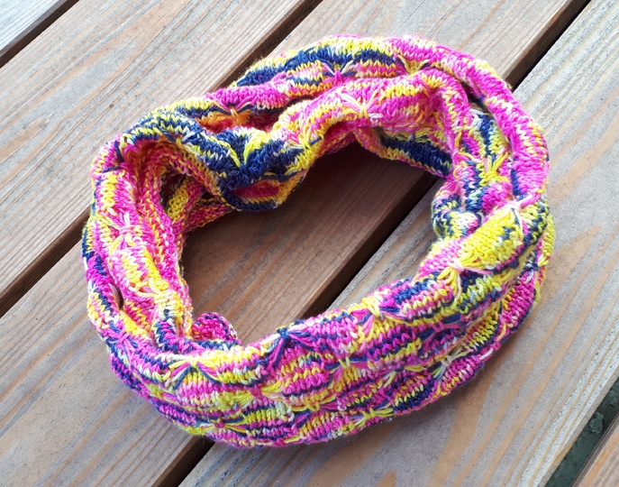Dieser feine Loop wärmt auch an luftigen Tagen und weckt dank kräftiger Farben und dem Muster wahre Frühlingsgefühle. Er sieht bestimmt auch wunderschön in einem frühlingshaften Farbverlauf aus.