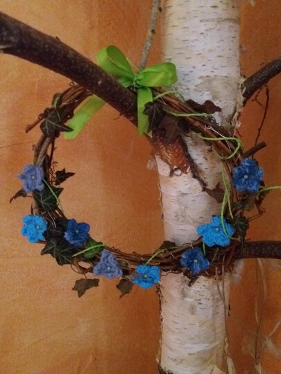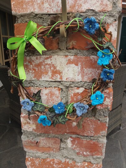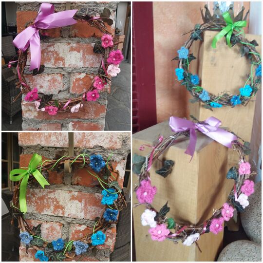 Die Blumen werden je nach Wollreste und Häkelnadel unterschiedlich groß meine Blumen haben einen Durchmesser von 4 - 4,5 cm. Den Kranz kannst du je nach Wunsch größer oder kleiner binden. Mein Kranz hat einen Durchmesser von 25 cm.