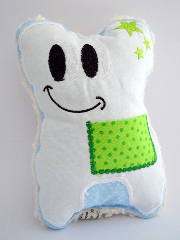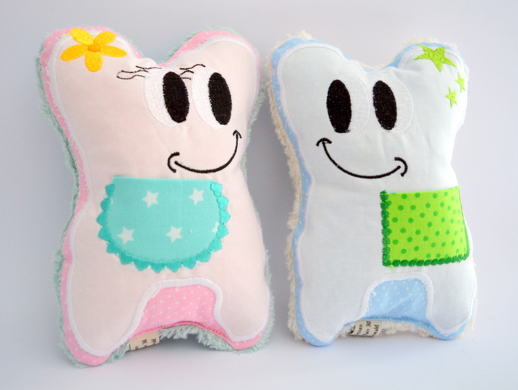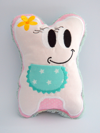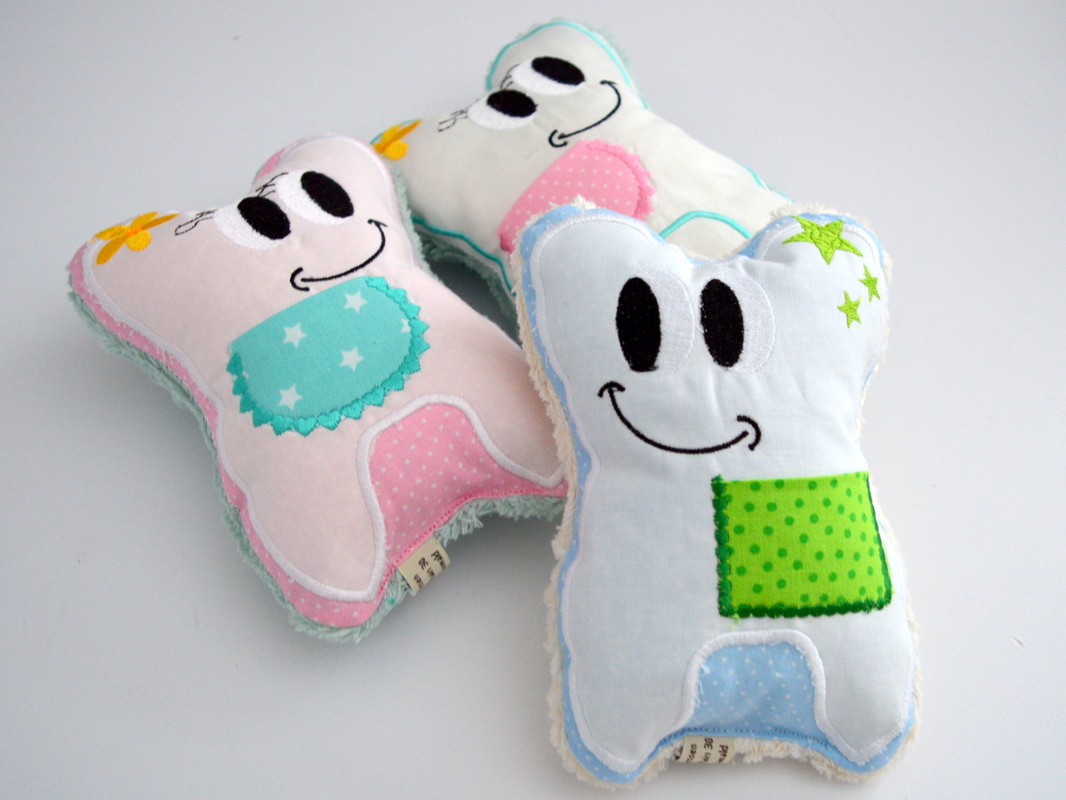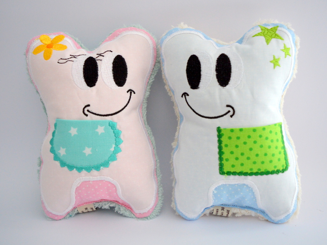 Die Zähne werden komplett im Rahmen von der Stickmaschine gestickt, es muss lediglich die Wendeöffnung von Hand geschlossen werden! Ein kleines Täschchen wird auf jeden Zahn mit aufgestickt. In diesem können die ausgefallenen Wackelzähne verschwinden, um von der Zahnfee geholt zu werden. Und auch die Geldmünze der Zahnfee hat wunderbar Platz!