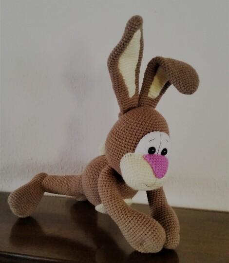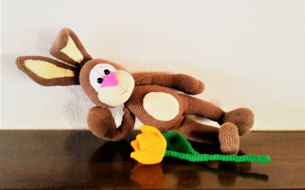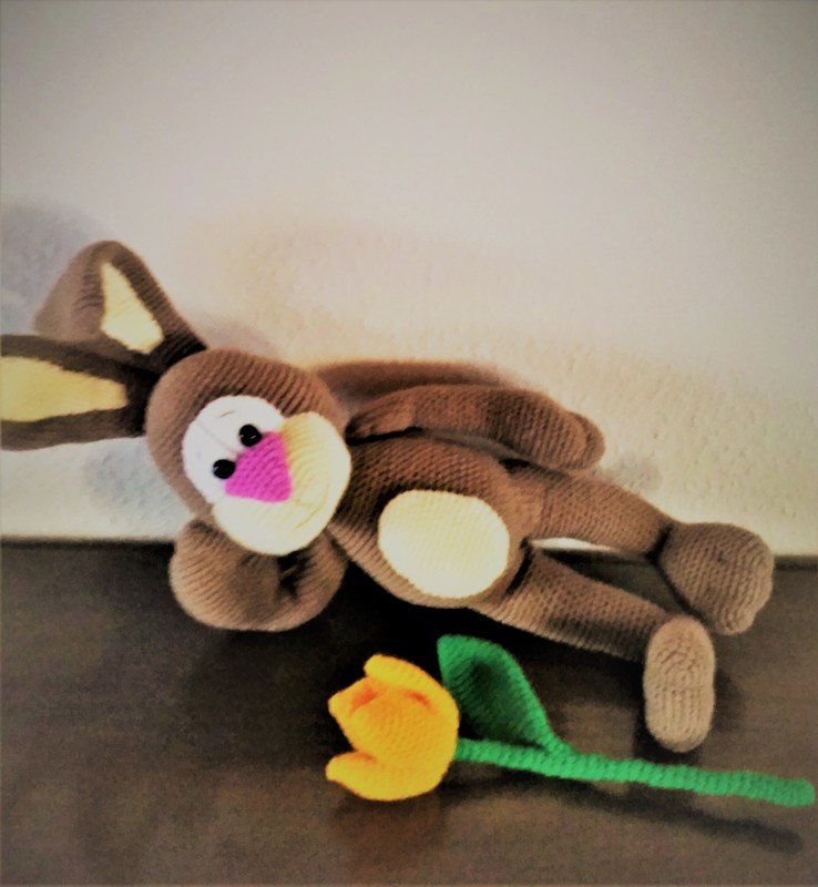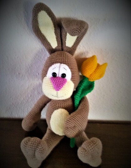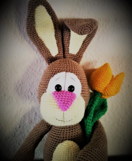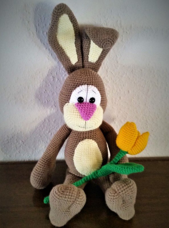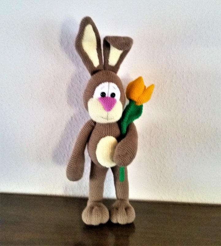 Bruno ist ein freundlicher Hase von ca 36 cm Größe. Mit aufgestellten Ohren misst er satte 47 cm.