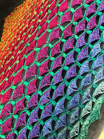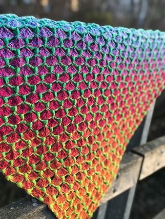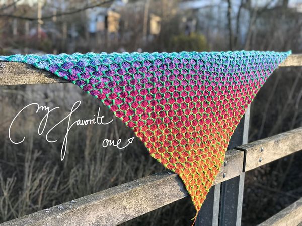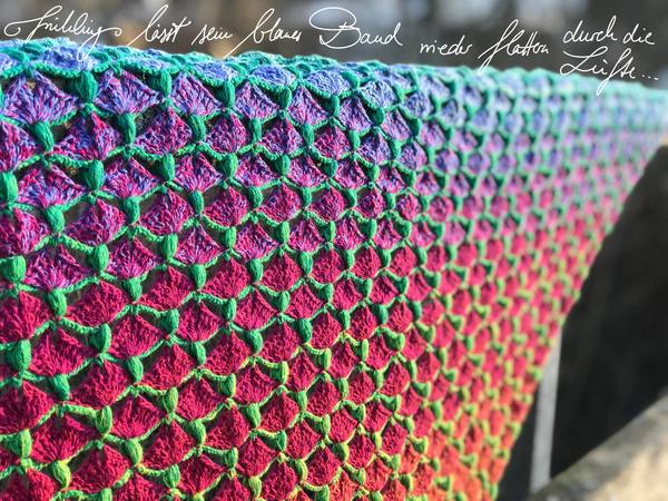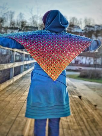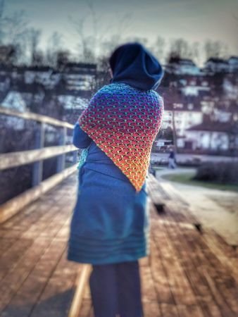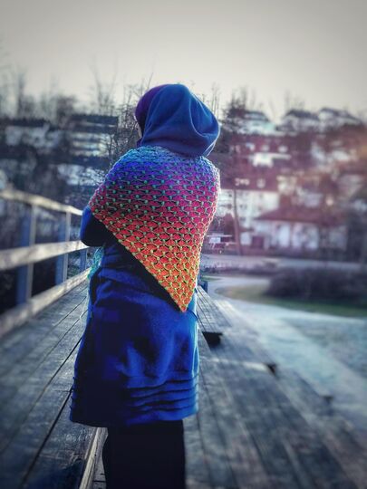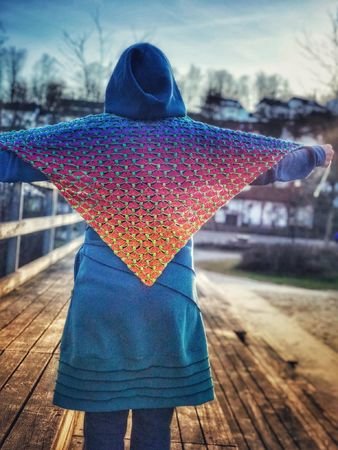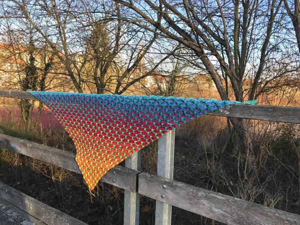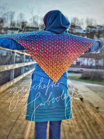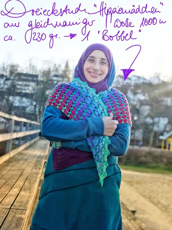 Bei diesem Muster handelt es sich eigentlich um ein Muster, was im türkischen Bereich als klassisches Brauttuch gerne gehäkelt wird. Da jedoch in fluffig-flauschigem Mohair oder anders haarig und mit dünner Nadel. Ich bin als "Frau Ö" jedoch bekannt dafür, aus "alt" - neu zu machen oder eben aus konventionell was trendiges. Daher lasse ich mir eine dafür geeignete Wolle wickeln mit einem bombastisch passenden Farbverlauf.