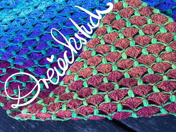 Die Grösse des Tuches variiert je nach Beschaffenheit der Wolle sowie Deines Häkelcharakters. Du solltest das Tuch unbedingt spannen!