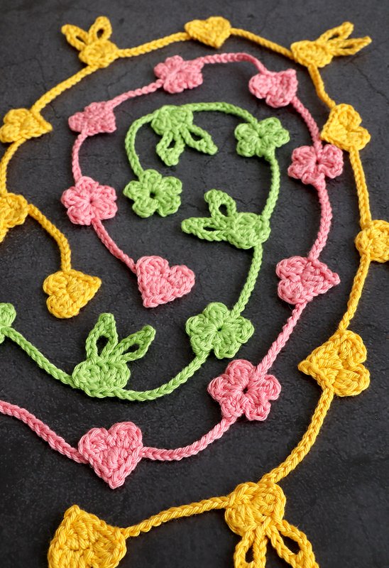 Die Motive dieser süßen Dekokette sind beliebig untereinander kombinierbar. Auch kannst du z. B. eine Kette nur mit Herzen oder nur mit Blüten häkeln.