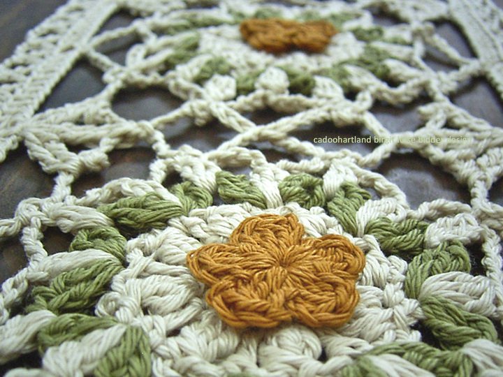 Die Baumwoll-Blüten werden extra gehäkelt und eingefügt oder angenäht.