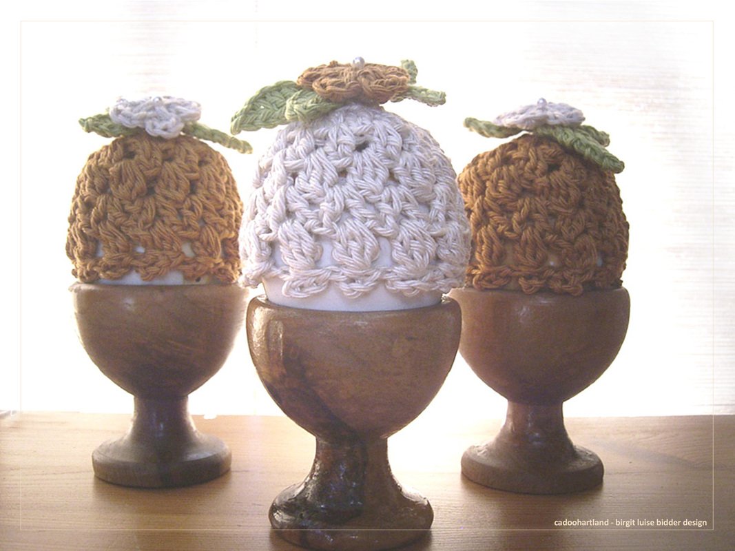 frisch aus der Werkstatt aufgetischte Eierwärmer im Gipüre-Spitzen-Style