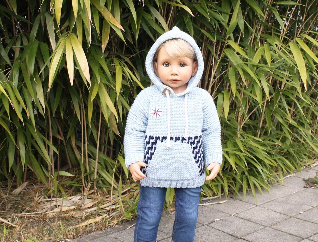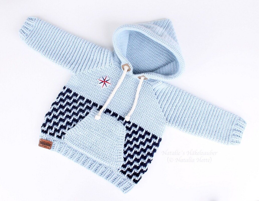 Diese PDF-Häkelanleitung besteht aus bebilderter Anleitung zum Häkeln von Hoodie mit 3D-Muster für Erwachsene (Gr. XS bis XXL) und Kinder (Gr. 92 - 158) mit Kapuze und zweifarbigem Muster (Ärmel mit Reliefmuster). Dieser Kapuzenpullover ist ziemlich leicht zu häkeln, so dass die Anleitung auch für Anfänger mit Vorkenntnissen geeignet ist, jedoch nicht als erstes Häkelprojekt tauglich.