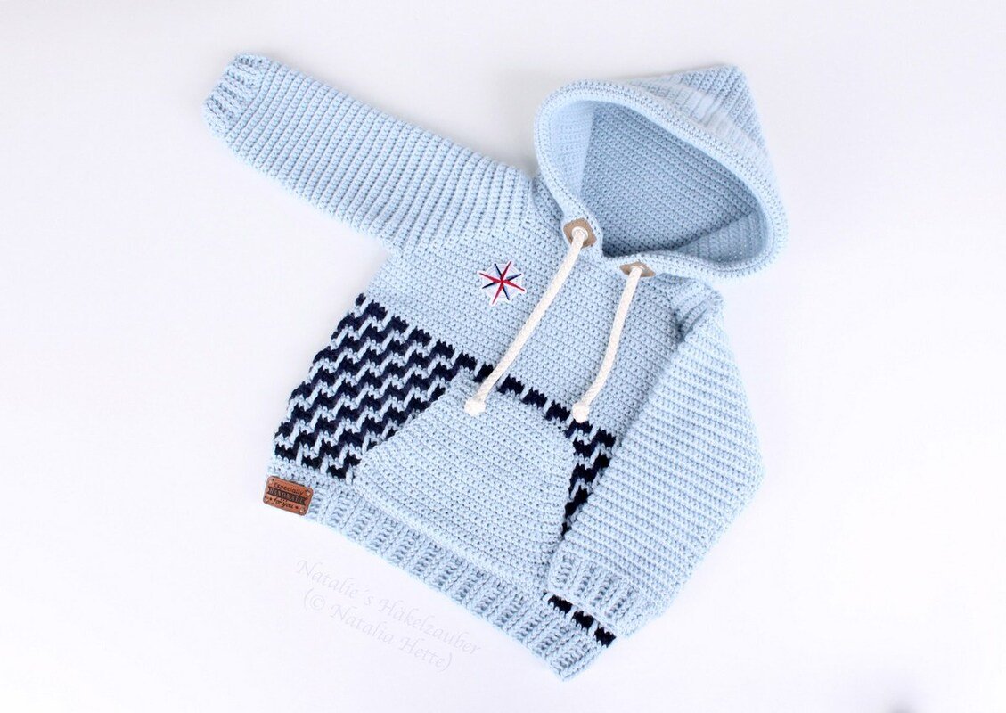 Du hast bereits Vorkenntnisse (feste Maschen, Kettmaschen, Häkeln in Runden und Reihen, Reliefstäbchen) und möchtest etwas Interessantes für Dich und Dein Kind häkeln? Dann ist diese Häkelanleitung wie für Dich gedacht. Mit dieser Anleitung kannst Du schnell und problemlos einen Hoodie häkeln, der von unten ein verspieltes, zweifarbiges 3D-Muster hat und an den Ärmeln ein Reliefmuster. Dieser Hoodie ist und sowohl für sportliche Aktivitäten, als auch für Spaziergänge sehr gut geeignet. Dieser Pullover kann sowohl für den Winter als auch für den Sommer gehäkelt werden (abhängig von der Wolle).