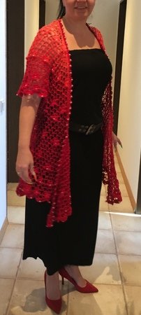 Es kann mit langem, kurzem oder ohne Zipfel gehäkelt werden. Auch die Länge gestaltest du dir nach deinen Vorstellungen. Das regenbogenfarbene Modell hat einen kurzen Zipfel, das rote Modell einen langen und das blaue gar keinen. Ich gebe dir hierzu verschiedene Möglichkeiten. Die Jacke wird in einem Stück von oben nach unten gehäkelt. Die Perlen werden gleich mit eingehäkelt.