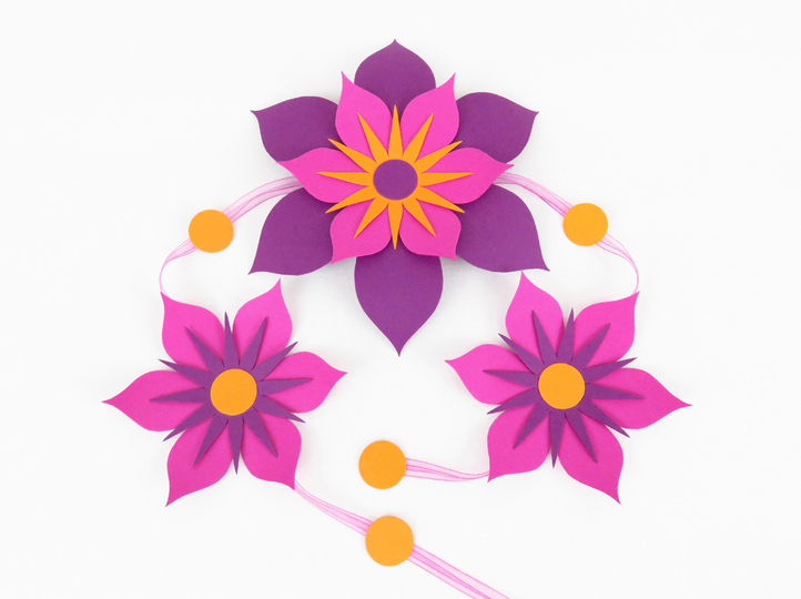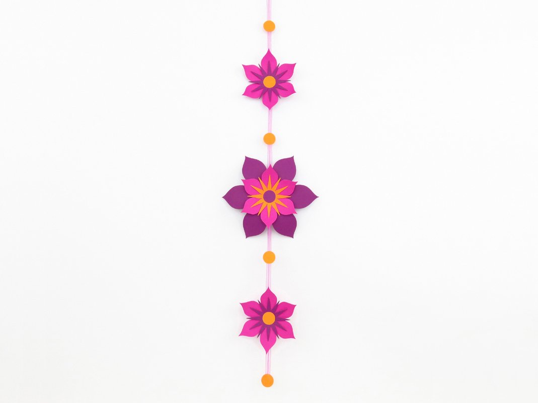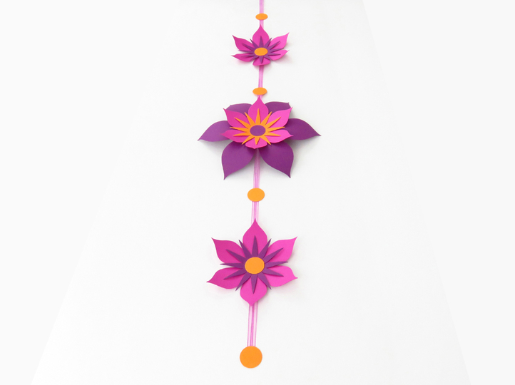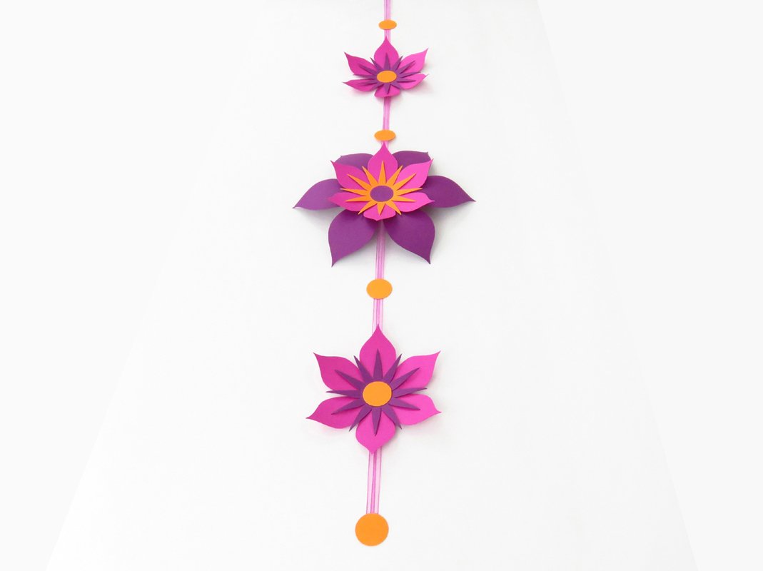 Die Kette wird ca. 70 cm lang, die große Blume ca. 18 cm, die kleinen – ca. 12 cm groß.