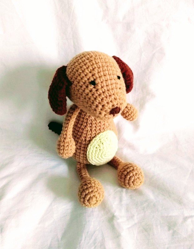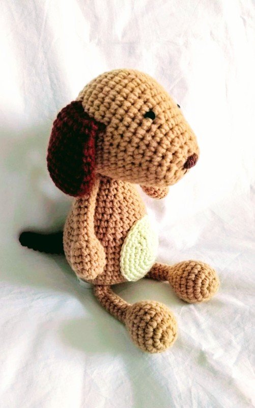 Wenn Du den Hund mit den, in der Anleitung angegebenen Materiallien häkelst, wird er ca. 25 cm groß