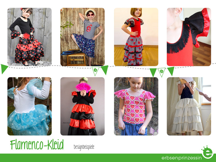 Neben typischen Flamenco-Kleidern kannst nach dem Schnitt natürlich auch die tollsten Kostüme nähen: Prinzessinnen und Tänzerinnen, Hexen, Feen,… – einfach alles, was nach Kleid und Show verlangt!