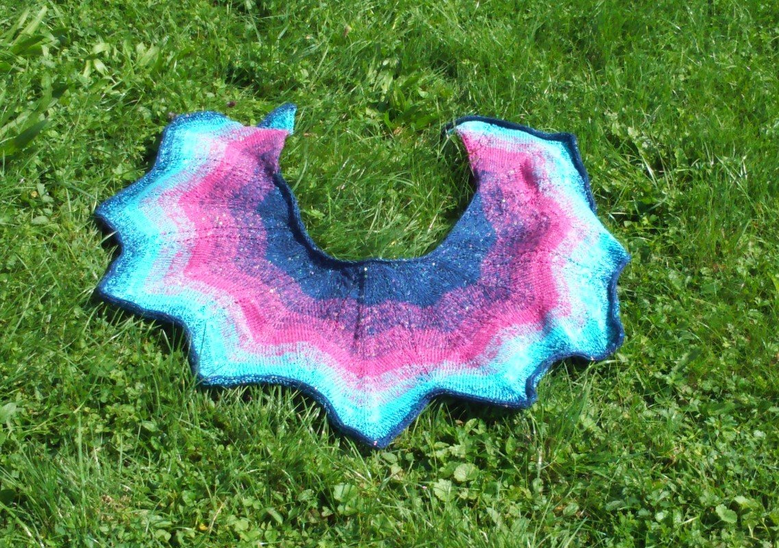 Die Namensgeberin für dieses Tuch ist meine 4-jährige Enkeltochter, die meinte, das sieht wie eine Fledermaus aus. Und da ich dieses für sie gestrickt habe, wurde daraus das Fledermäuschen.