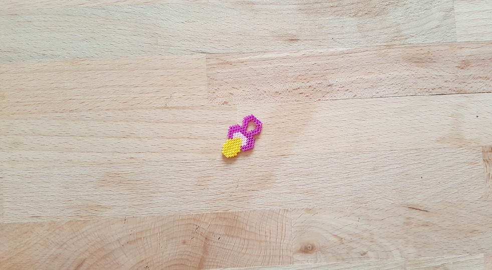 auf PDF die Vorlage für einen süßen kleinen Schnuller z.B. für Charms / Anhänger / Ohrring mit Mengenangabe der benötigten Perlen und Foto des fertigen Werkes