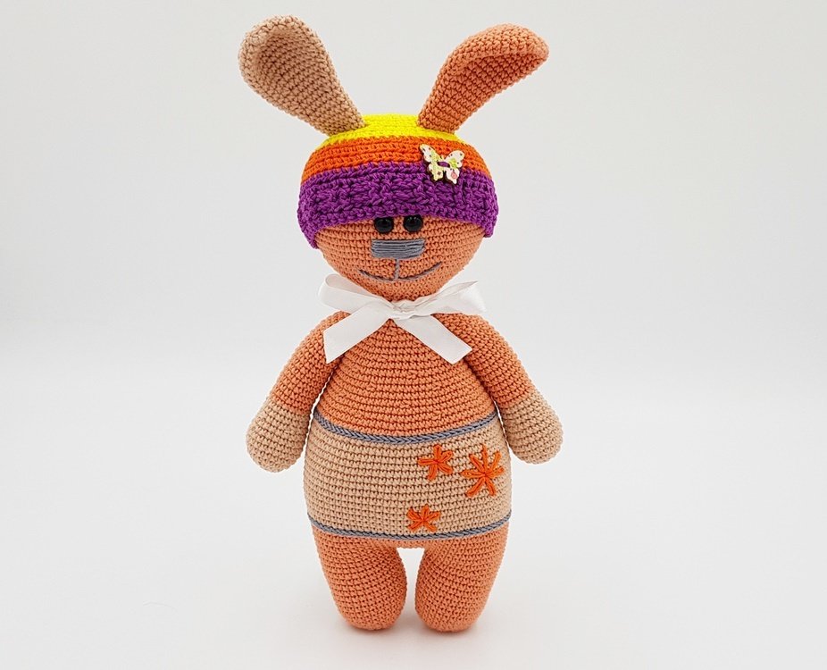 Mit dem angegebenen Material wird der Knuddelhase ungefähr 29 cm groß – ohne Ohren.