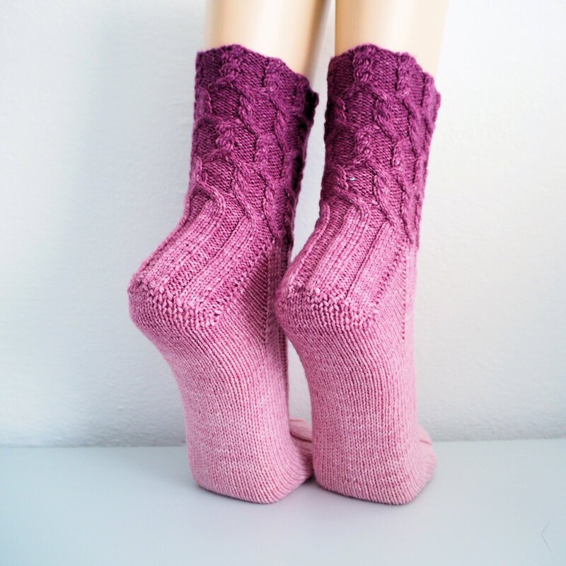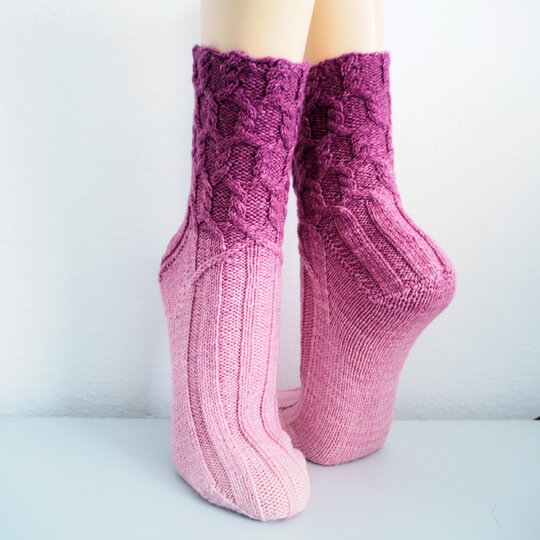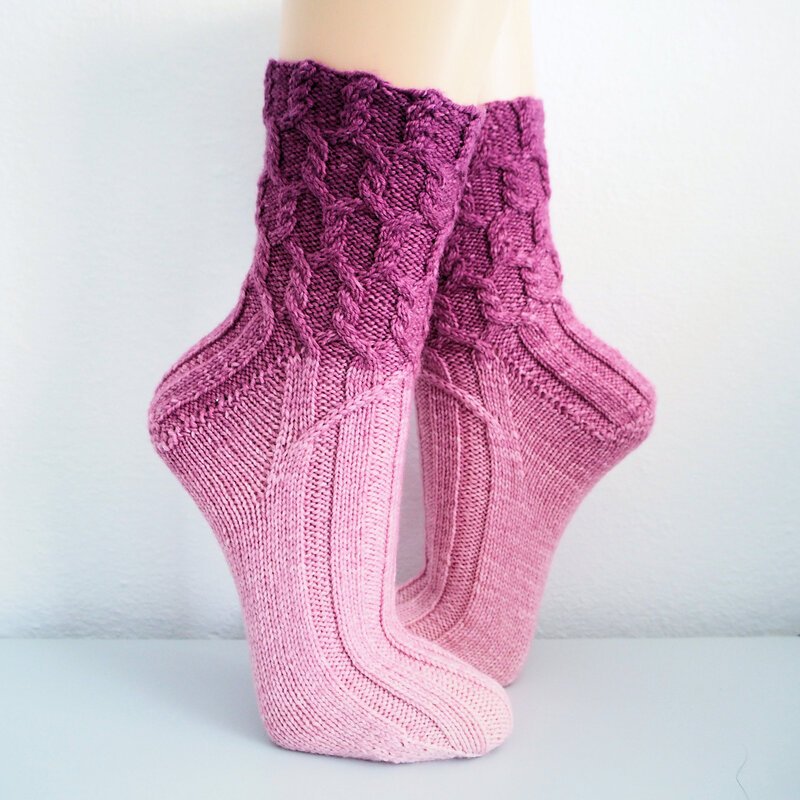 Romantisch verschlungene Zöpfe und klare Linien spiegeln sich in diesem Sockenmuster wider. Es braucht eine etwas höhere Maschenzahl, damit der Schaft nicht zu eng sitzt wegen der vielen Verzopfungen, es entsteht dabei aber auch eine klare Struktur.