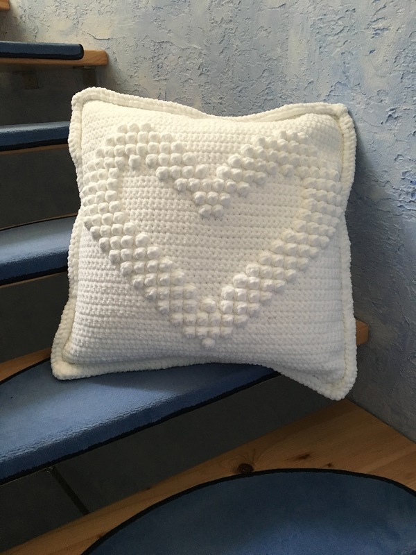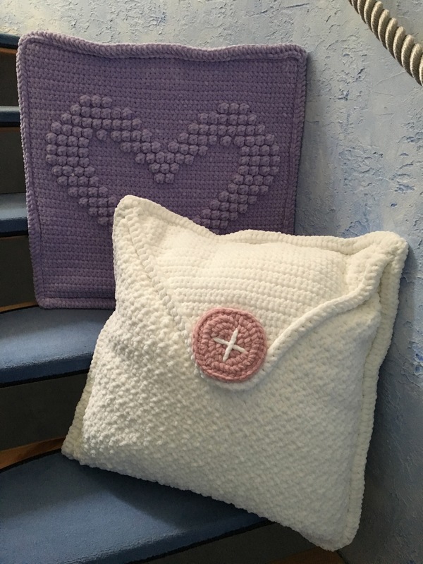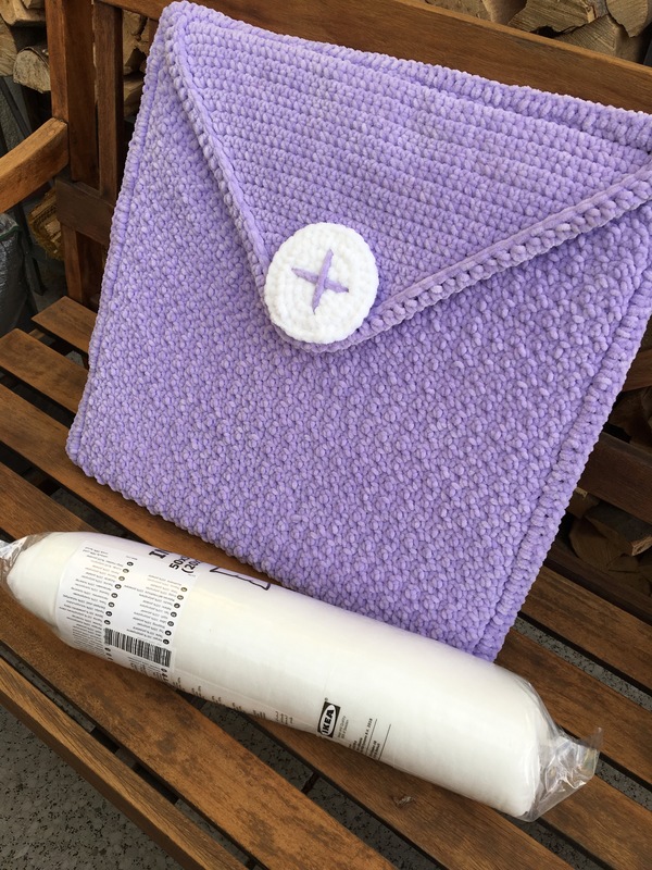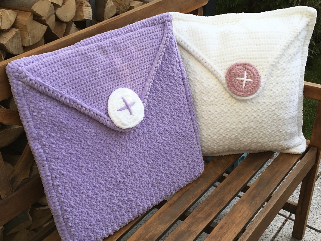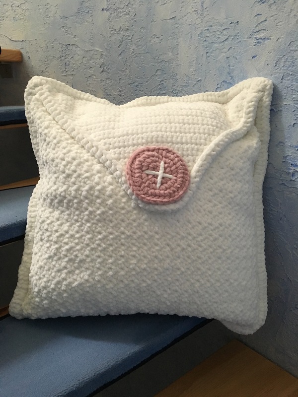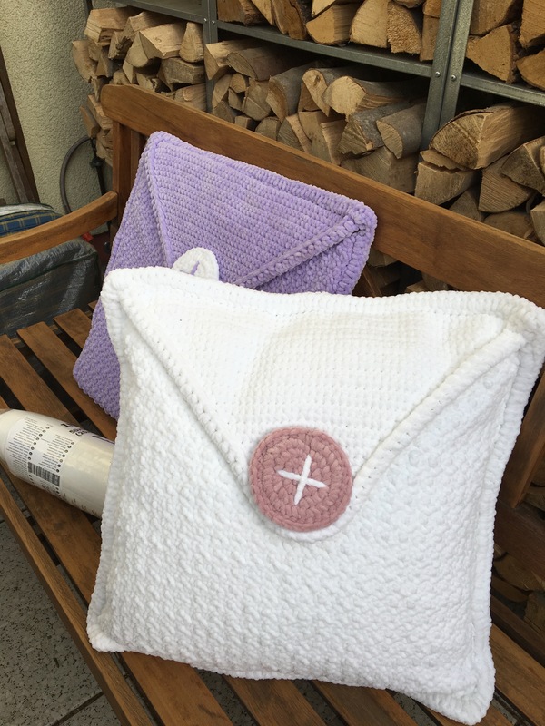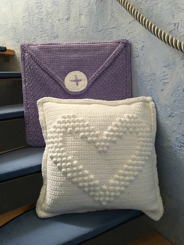 Du bekommst die Häkel-Anleitung für das Herz-Kissen und die Rückseite, die wie ein großer Briefumschlag aussieht.