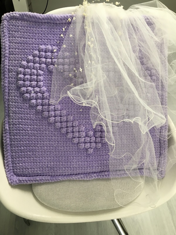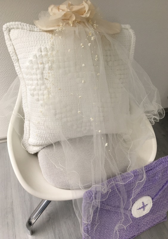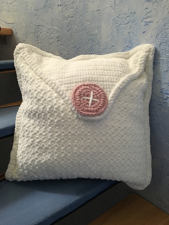 Dieses Kissen, gehäkelt mit Chenille-Garn ist ein wunderschönes Geschenk für den/die Liebsten. Der dicke Rand, die Noppen und die Rückseite mit dem großen Knopf lassen es sehr kuschelig erscheinen. Es kann als Kissen dienen oder auch als riesige Geschenkverpackung. Wenn du es mit etwas Pappe stabilisierst, kannst du dort deine Wünsche und Genschenke hineintun. Wenn du die Kissenfüllung dazu überreichst, verwandelt es sich dann in ein Kuschelkissen. Perfekt für ein z.B. Hochzeitsgeschenk oder Valentinstag. Es ist ordentlich groß und nicht zu übersehen.