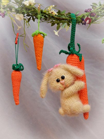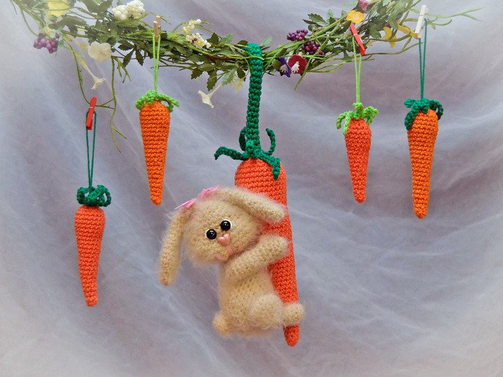 Häkelanleitung kleiner Hase an Karotte mit kleinen Karottenanhängern