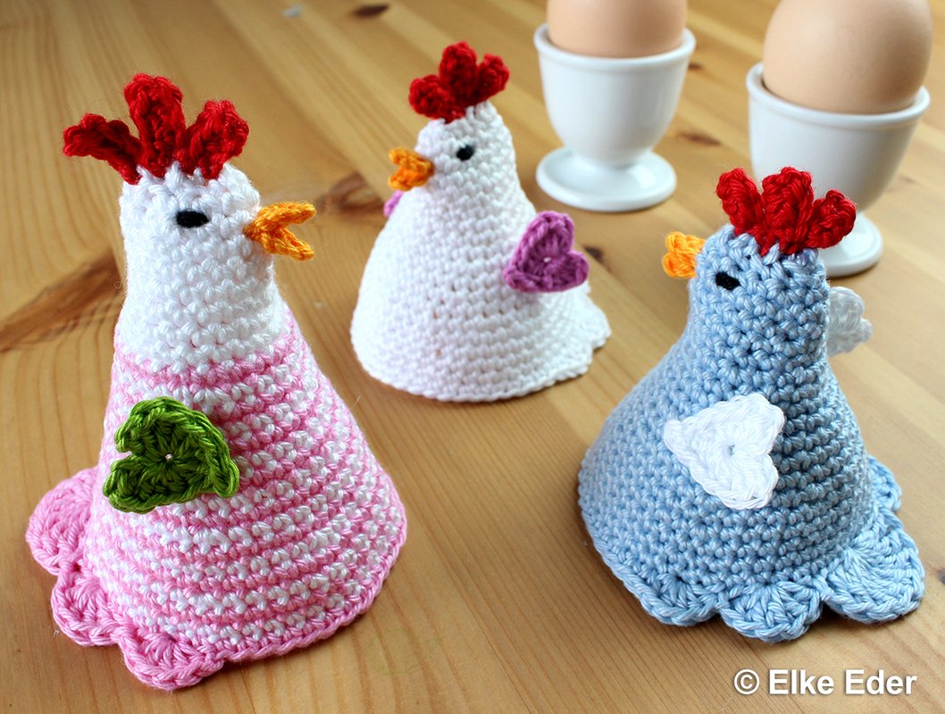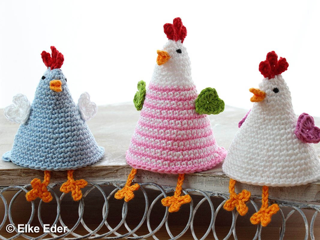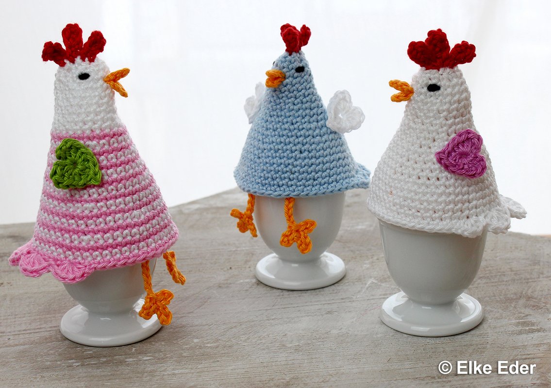 Du kannst diese geselligen Hennen als Eierwärmer, Kantenhocker oder süße Tischdeko - vielleicht mit ein paar Schokoeiern darunter versteckt - einsetzen. Auch ein wunderbares Geschenk oder Mitbringsel.