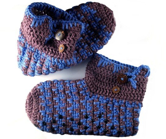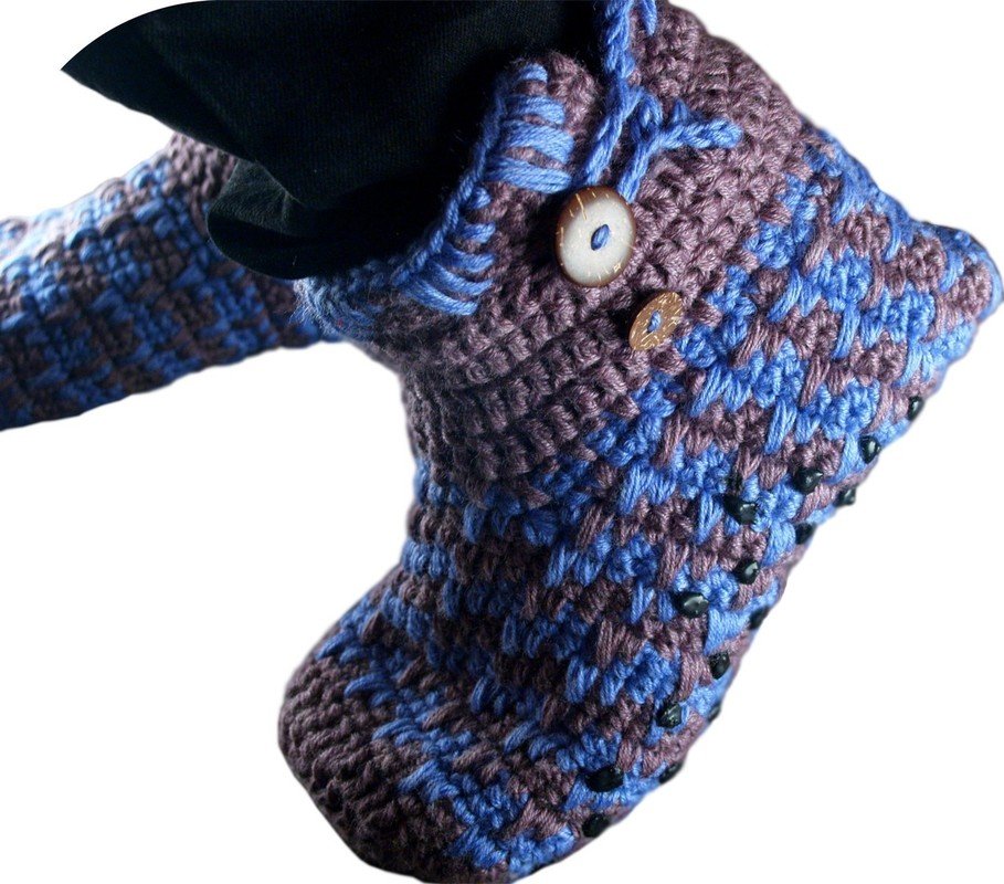 Die Schuhe sind mit dicker Wolle angefertigt und haben als Extra eine gehäkelte Innensohle, damit ja keine Kälte durchkommt. Für den sicheren Gang sorgen Gumminoppen und für den coolen Mokassins-Look das Ethnomuster in braun und blau (Farbe individualisierbar).